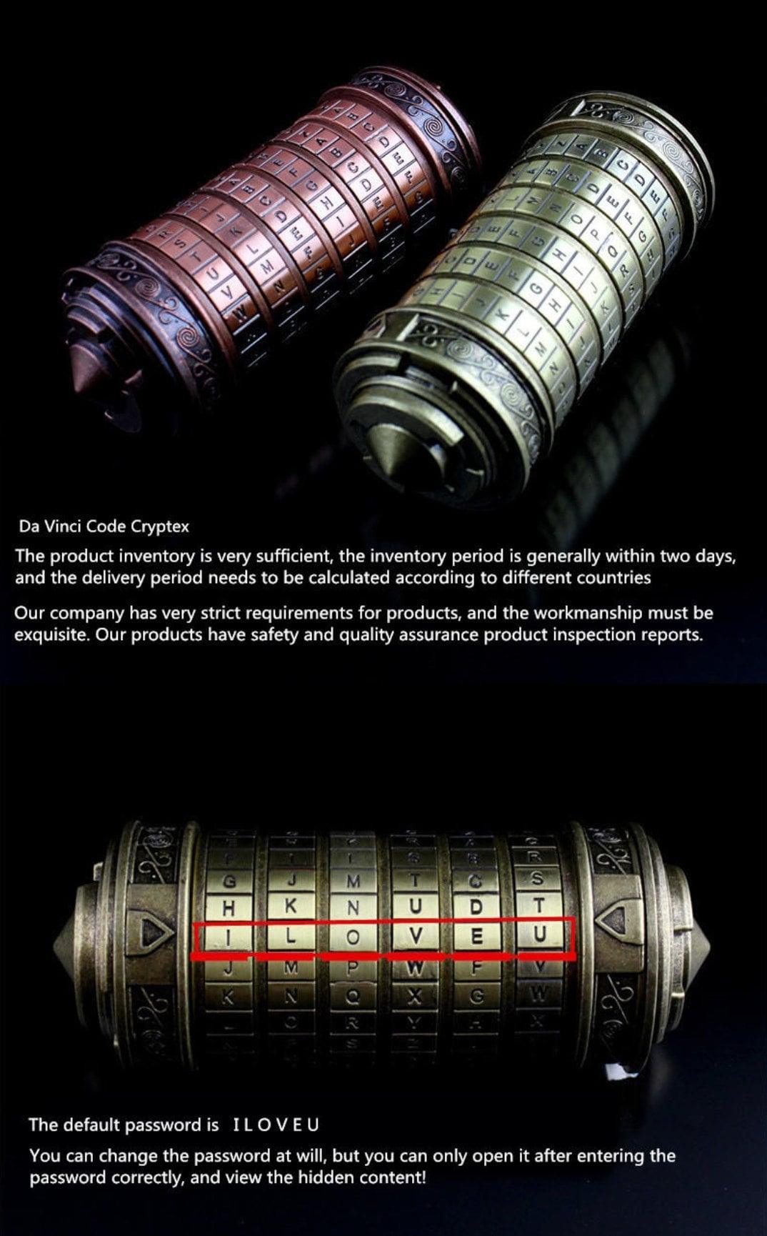 Description The Da Vinci Code Cryptex is the most interesting gift for a friend. It opens with passwords that you can configure and change at any time. Store your notes, poems, jewelry, keys, or other valuables.